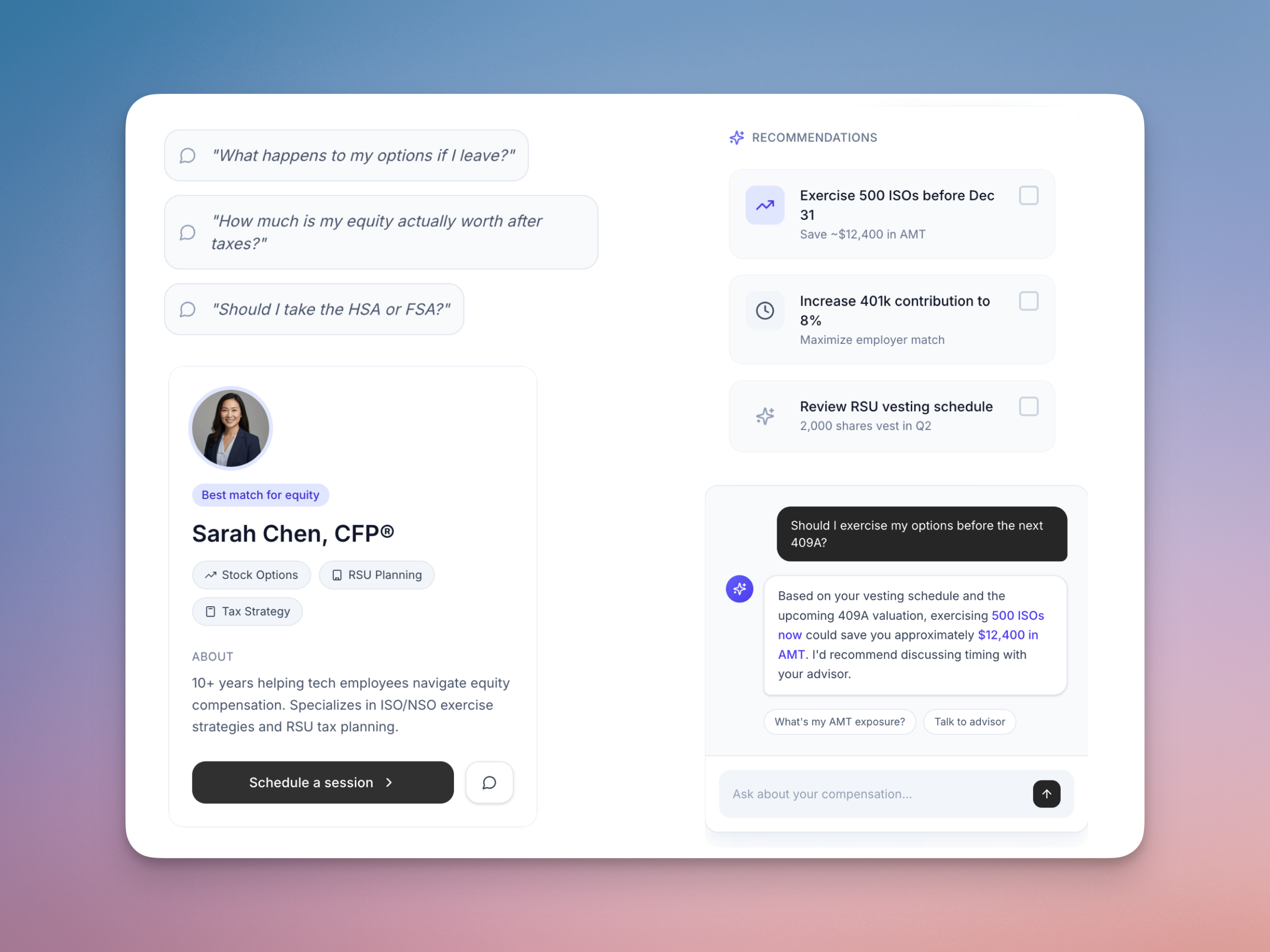 Our AI doesn’t just wait for questions—it surfaces the right recommendations at the right time. Employees get proactive nudges on benefits, equity, and life decisions, with human experts one tap away. HR sees where their team needs support—and how and when to step in.