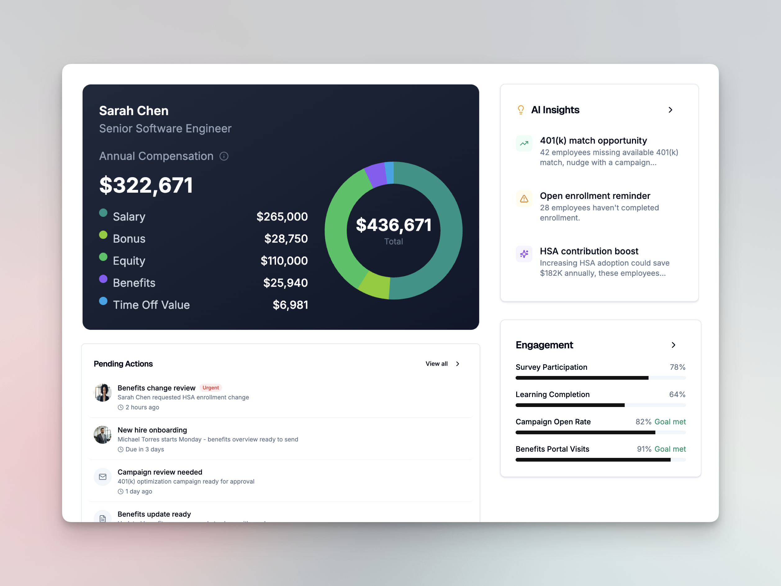 Each employee sees what they have, what it’s worth, and what to do next—across onboarding, open enrollment, and key moments.